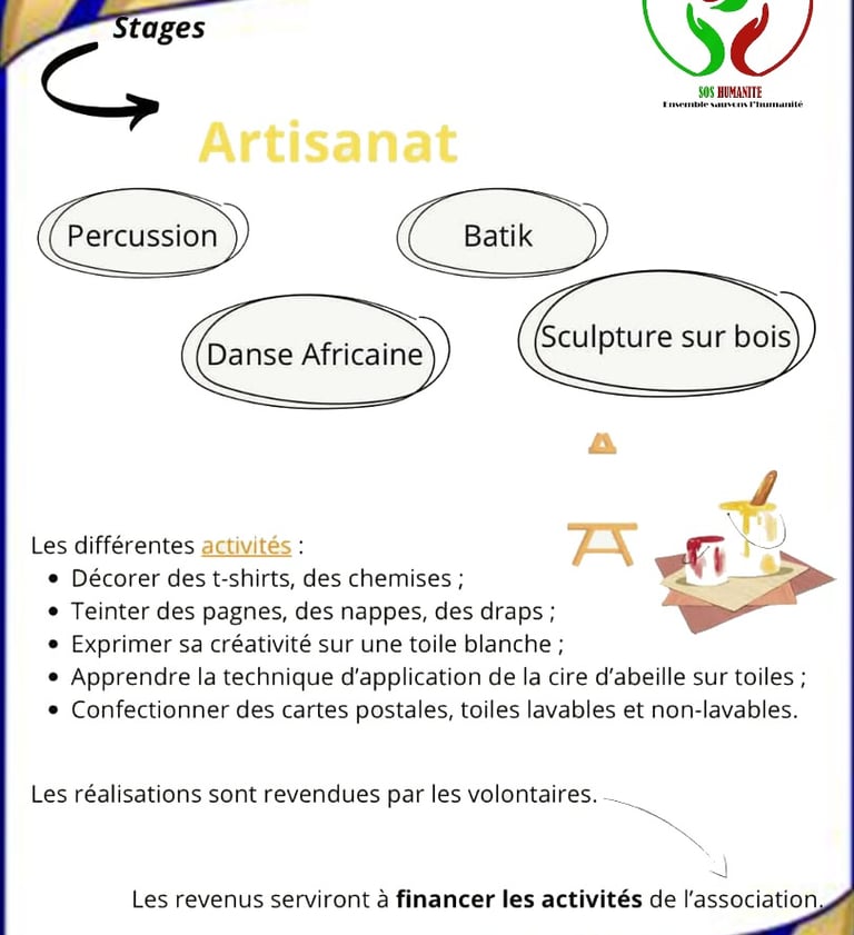 Rejoignez SOS-HUMANITÉ pour un stage pratique en artisanat et contribuez à valoriser les savoir-faire locaux. Développez vos compétences, partagez votre créativité et participez à un projet qui soutient les communautés togolaises tout en découvrant un environnement humain et solidaire.